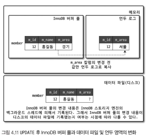 - UPDATE 문이 실행되면 InnoDB의 버퍼 풀은 새로운 값으로 변경되고, 기존 값은 언두 로그에 복사된다.