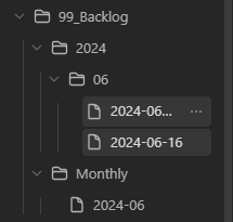 2024-06-17은 daily note인데 여기서 작성한 daily note는 오늘을 마무리하며 이런식으로 백로그를 작성한뒤 99_backlog로 이동된다.