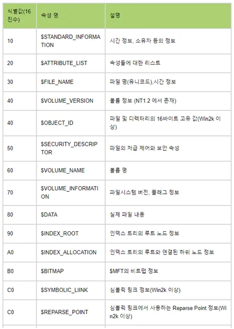 | Attribute Area | 0x38 - 가변 | 파일 이름, 변경 시각, 데이터, 위치 들 속성(Attribute)들이 나열되는 영역 |