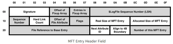 MFT Entry 첫 필드는 시그니처, 보통 b’FILE’ . 하지만, Entry 오류 등이 생길 시 b’BAAD’ 값을 가짐.
