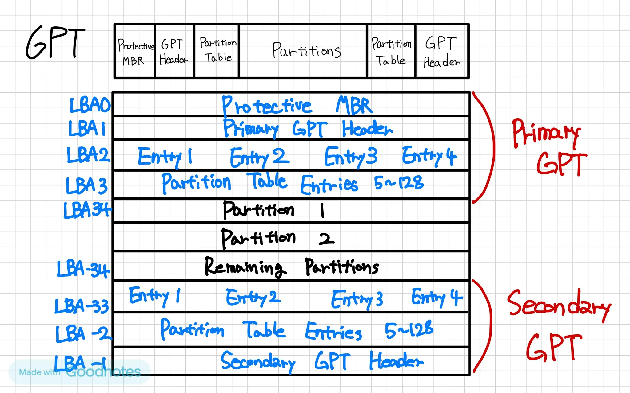 각 파티션에 대한 대부분의 정보를 담고 있고, MBR의 Partition Table의 LBA 주소는 4Byte 로 기록하지만 GPT는 8Byte로 기록함.