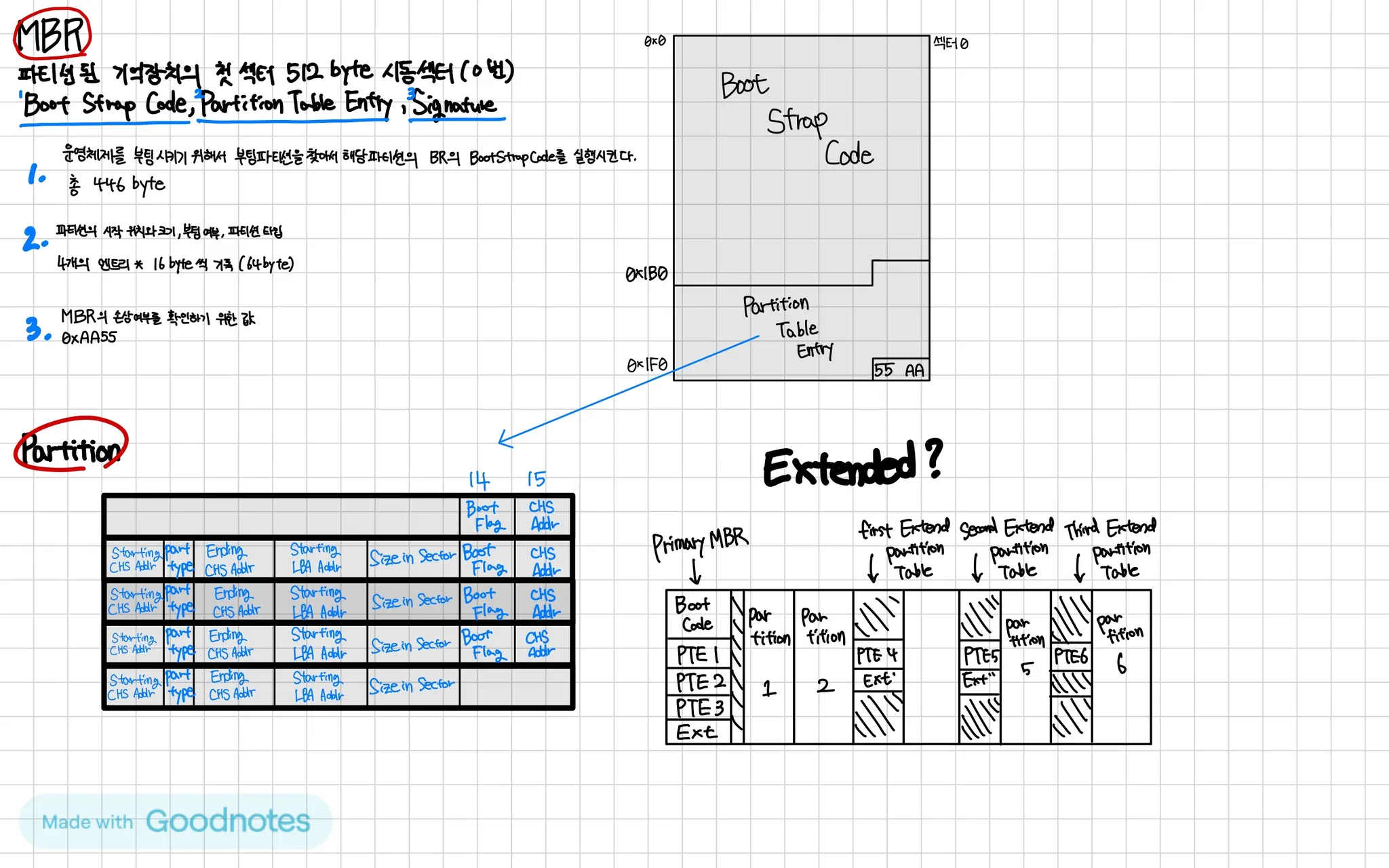 4개 이상의 Partition을 만드는 경우 첫 번째 Sector에 위치한 주 Partition Table의 Partition Table Entry #4 는 Extended Partition을 나타내는 Entry 값으로 채워짐.