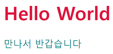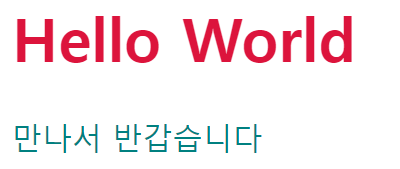 <!DOCTYPE html> <html lang="ko"> <head> <meta charset="UTF-8"> <meta name="viewport" content="width=device-width, initial-scale=1.0"> <title>Document</title> <style> h1 { color: crimson; } p { color: teal; } </style> </head> <body> <h1>Hello World</h1> <p>만나서 반갑습니다</p> </body> </html>