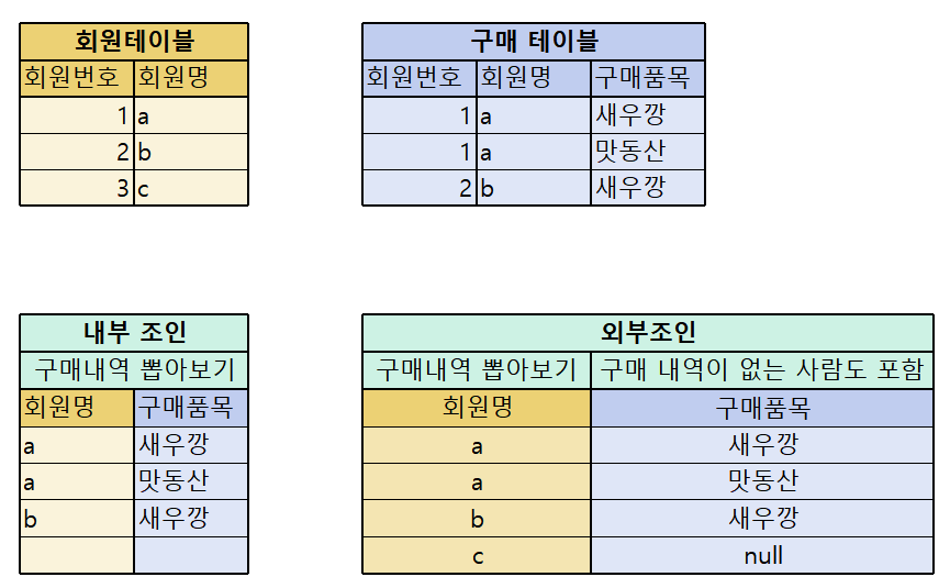 테이블을 결합하여 한 번에 조회하는 방식이다.PK-FK 관계를 맺은 테이블끼리 조인을 이용해서 처리할 수 있다.1) 내부 조인 (Inner Join) ⭐