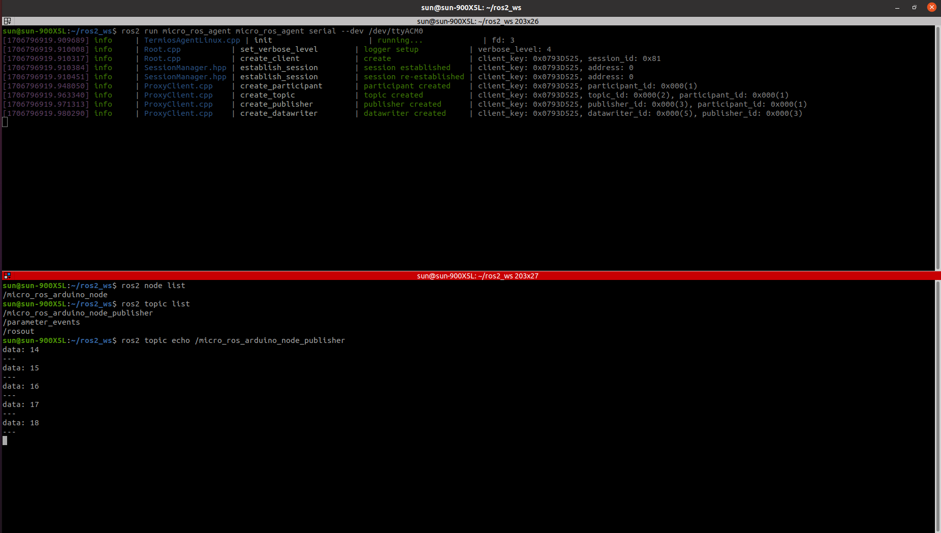 다음 사진은 ros2 topic echo를 통해 아두이노의 topic을 받아오는 장면이다.