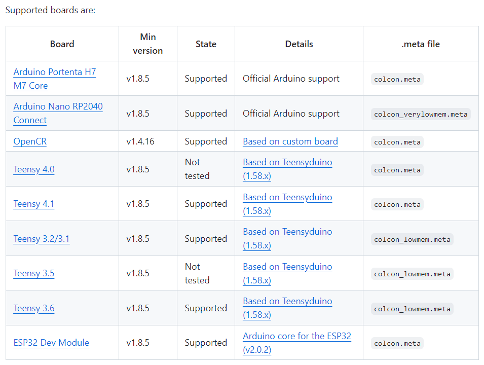 MICRO-ros(gitHub) 라이브러리에 대한 정보를 확인해보면 Arduino는 ortenta, Nano, Due, Zero만 지원되는 것을 확인할 수 있다.