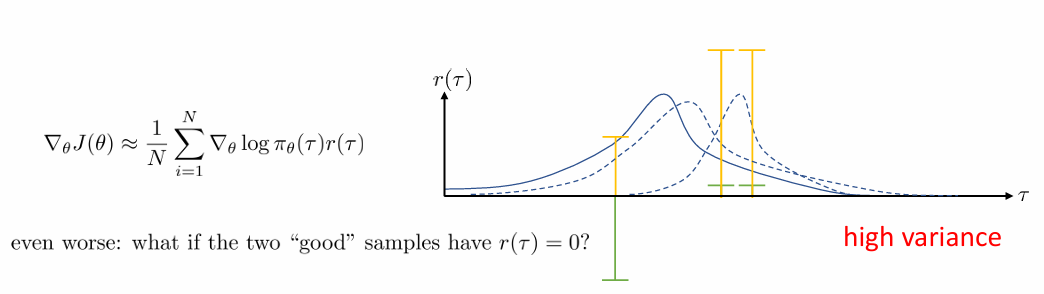 policy gradient는 high variance를 가지고 있습니다. 따라서 단순히 maximum likelihood를 이용하는 방법만으로는 충분하지 않습니다.
