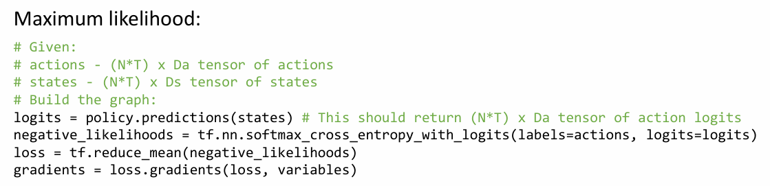 먼저 policy로 prediction을 하면 각 시행에서 각 timestep에 대한 action의 확률 logits를 반환합니다(softmax 해야 우리가 원하는 πθ(ai,t∣si,t)가 됨). 그러면 actions와 cross entropy를 계산하게 됩니다. maximum likelihood에서는 최선의 action이 정해져있으니, 선택된 action의 logits만 추출되어, 모든 시행에서 모든 t한 loss는 결국 J~를 나타내게 됩니다. 그러면 gradient를 바로 구할 수 있죠.