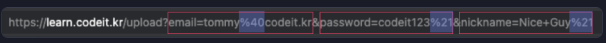 회원 가입 버튼을 누르면 나타나는 주소창 이미지이다. 이렇게 form 태그는 바로 사용자의 입력값을 URL의 query 부분에 application/x-www-form-urlencoded 타입으로 나타낸 URL로 request를 보내는 것이다.