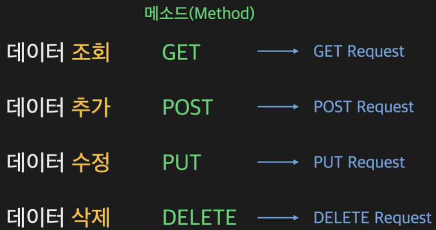 결국 각각의 메소드에 대해서 서버는 그에 맞는 데이터 관련 조작을 하게 된다. 만약 서버가 데이터베이스를 사용한다면 CRUD 작업을 하게 된다. CRUD란 Create-Read-Update-Delete의 약자로 데이터베이스 관점에서 데이터에 관한 처리를 나타내는 합성어이다.