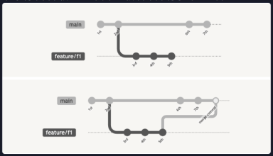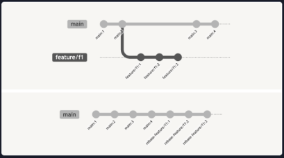 Squash and Merge는 브랜치에서의 모든 변경 사항을 하나의 커밋으로 압축하여 병합하는 방식이다. 이 방식은 각각의 커밋에서 발생한 모든 변경 사항을 병합 후에 하나의 새로운 커밋을 생성한다. 위 이미지에서 3rd-4th-5th 커밋이 하나의 커밋 feature/f1으로 합쳐져서 병합이 된 것을 확인할 수 있다.
