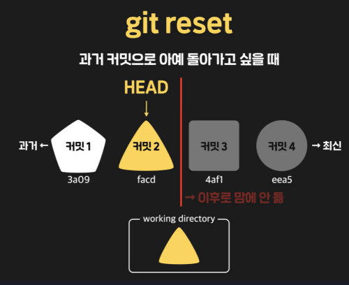 git reset을 통해 HEAD가 과거의 커밋을 가리키게 할 수 있다. working directory의 내용도 과거 커밋의 모습으로 돌아가게 된다. 즉, 과거 커밋으로 아예 돌아가고 싶을 때 사용된다.