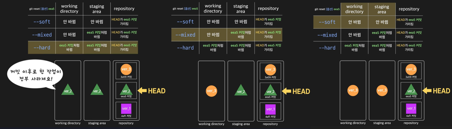--hard 옵션은 권장하지 않는다. 만약 모든 영역에서 사라져도 상관 없을 경우만 --hard 옵션을 사용하길 바란다.