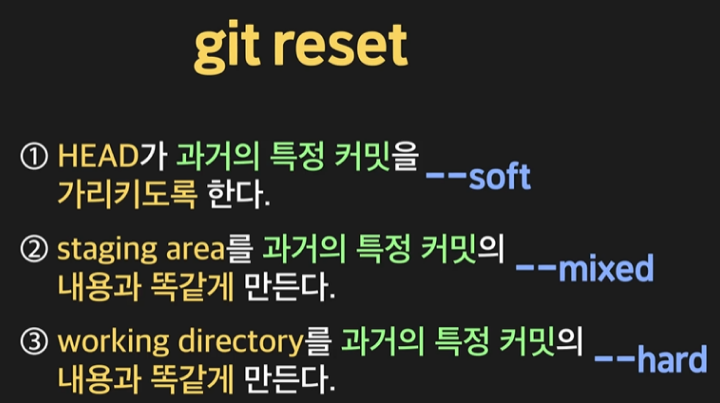 git log : 커밋 히스토리를 출력한다.git log --pretty=oneline : --pretty 옵션을 사용하면 커밋 히스토리를 다양한 방식으로 출력할 수 있다. --pretty 옵션에 oneline이라는 값을 주면 커밋 하나당 한 줄씩 출력해 준다.git show [커밋ID] : 특정 커밋에서 어떤 변경사항이 있었는지 확인한다.git commit --amend : 최신 커밋을 다시 수정해서 새로운 커밋으로 만든다.git config alias.[별명] [커맨드] : 길이가 긴 커맨드에 별명을 붙여서 이후로 별명으로 해당 커맨드를 실행할 수 있도록 설정한다.git diff [커밋A ID] [커밋B ID] : 두 커밋 간의 차이를 비교할 때 사용된다.git reset [옵션] [커밋ID] : 옵션에 따라 하는 작업이 달라진다. 옵션을 생략하면 --mixed 옵션이 적용된다.--soft--mixed--hardgit tag [태그이름] [커밋ID] : 특정 커밋에 태그를 붙일 때 사용된다.