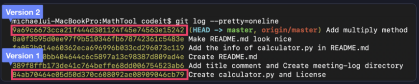 보통 프로젝트에서 주요 버전의 시작점이 되는 커밋에 이렇게 택그를 단다. 예를 들어 아래 그림에서 첫 번째 커밋에는 Version 1이라는 태그를 달고, 여섯 번째 커밋에는 Version 2라는 태그를 달고 싶다고 가정해보자.