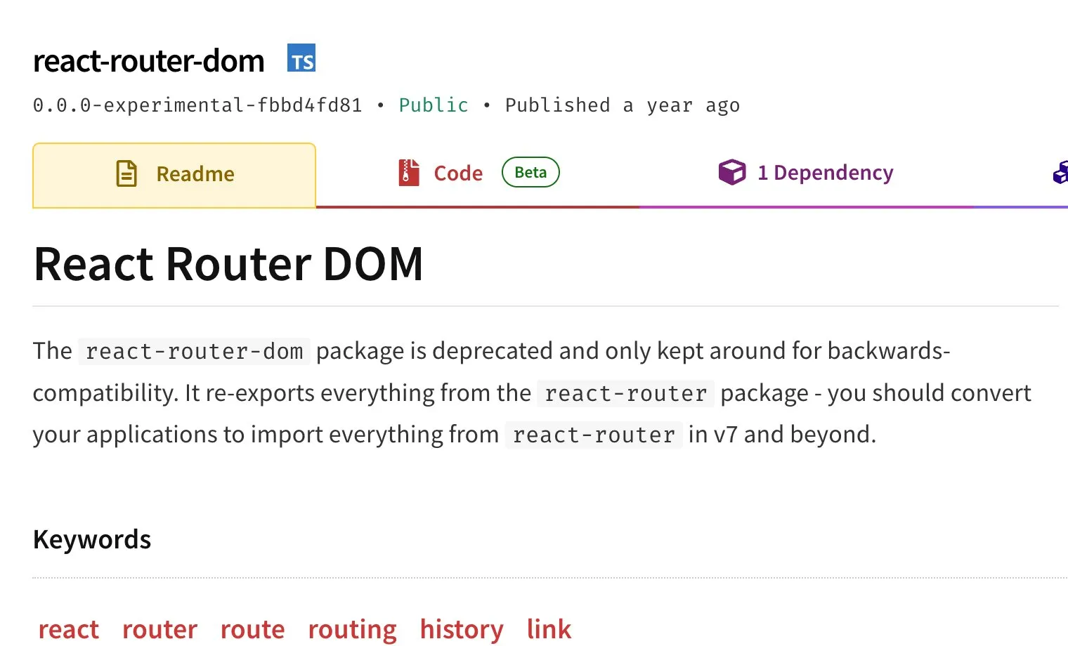 https://www.npmjs.com/package/react-router-dom/v/0.0.0-experimental-fbbd4fd81