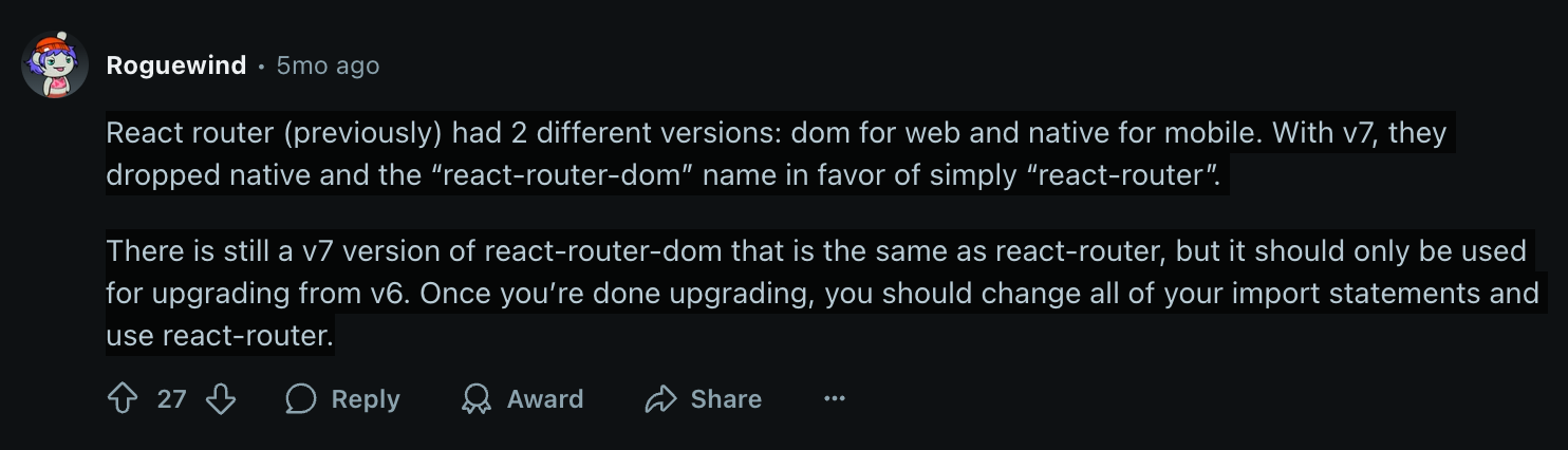 react-router와 동일한 react-router-dom의 v7 버전이 아직 있지만, v6에서 업그레이드할 때만 사용해야 합니다. 업그레이드가 완료되면 모든 import 구문을 변경하고 react-router를 사용해야 합니다.