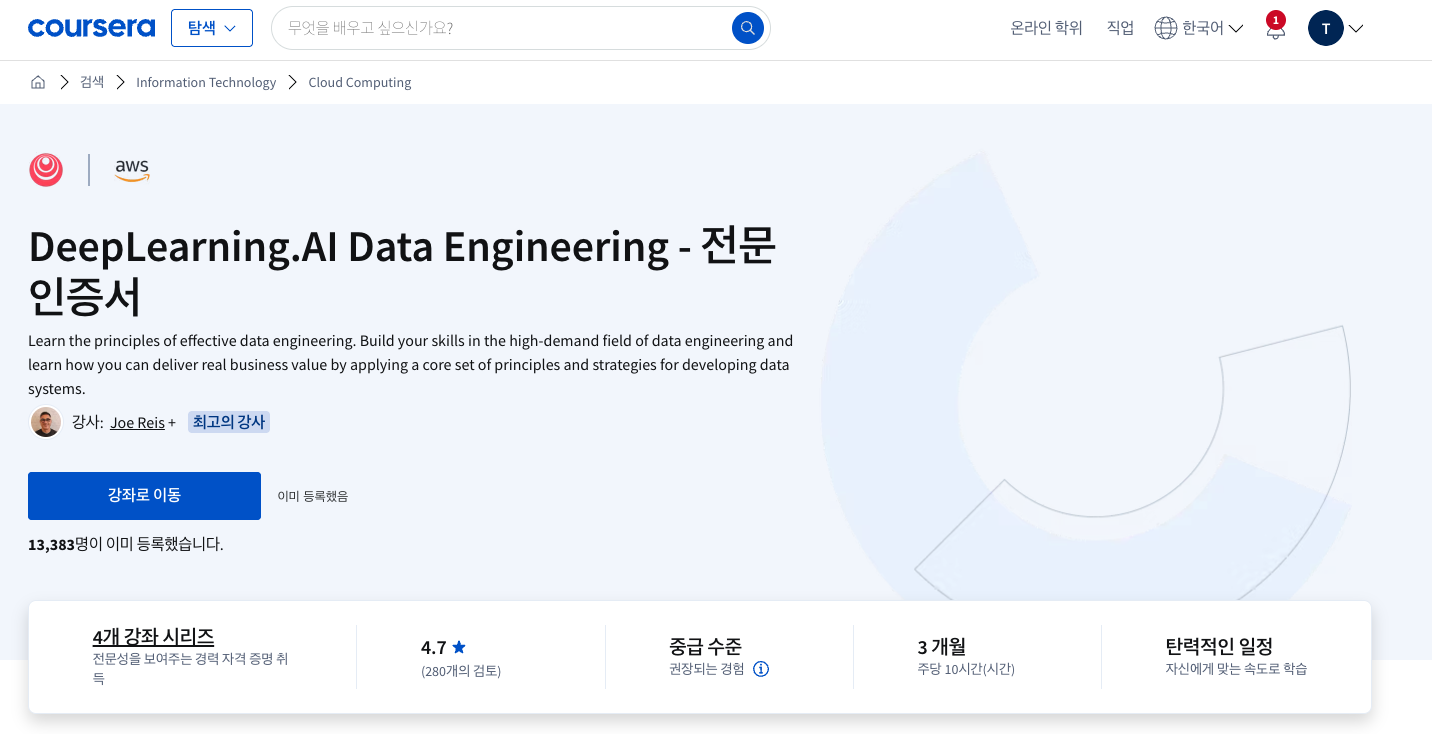 강의를 듣고 많은 생각이 들어서 미뤄뒀던 코세라의 data-engineering 강좌를 결제했습니다. 예전부터 한 번은 수강해야지 생각만 하고 있었는데, 인프런 강의를 수강하고 더 늦기 전에 배워야겠다는 생각이 들었습니다. 블로그에 적었으니 반드시 완강해서 후기로 돌아오겠습니다!