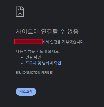 ERR_CONNECTION_REFUSED오류가 사라지질 않았다. 캐시를 지우고, 강력 새로고침도 소용없었다.