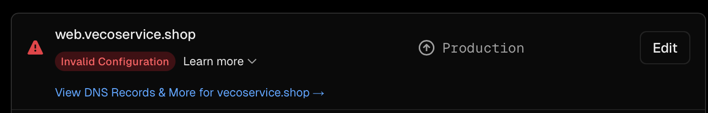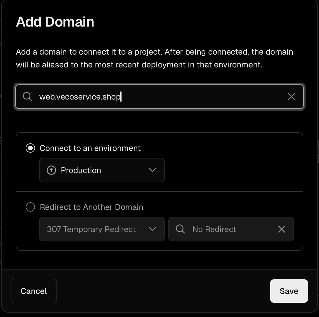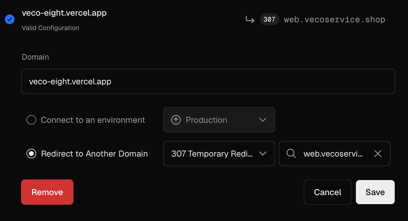 백엔드(vecoservice.shop)와 동일한 최상위 도메인을 공유하도록 했습니다.