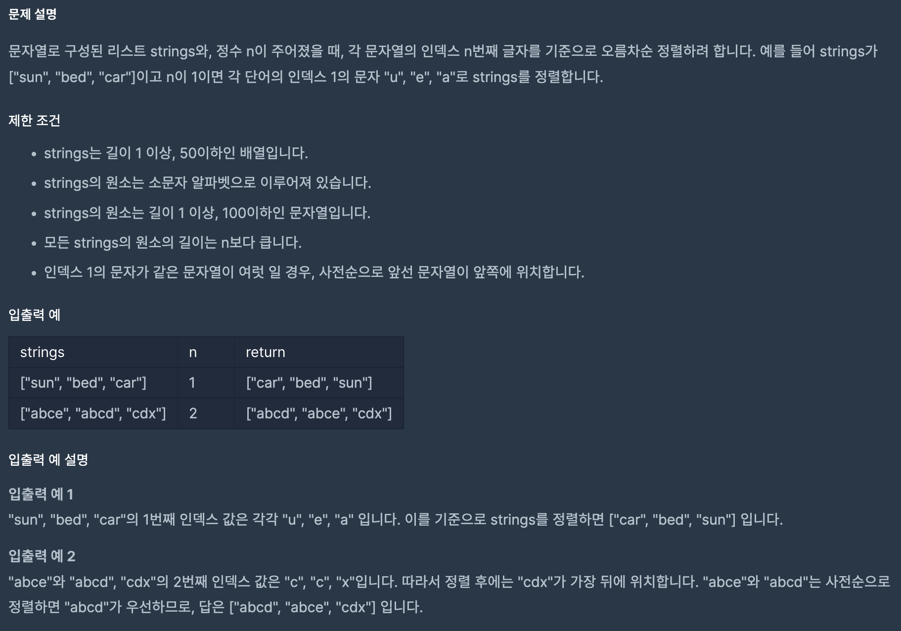 a 문자열의 n번째 인덱스 값과 b 문자열의 n번째 인덱스 값이 같은 경우에는 a 문자열 자체와 b 문자열 자체를 비교하여 정렬되어야 한다. 따라서 삼항연산자를 사용하여, a 문자열이 먼저 와야 하는 경우(a의 값이 더 작은 경우)와 b 문자열이 먼저 와야 하는 경우(b의 값이 더 작은 경우) 나누어 코드를 작성한다.