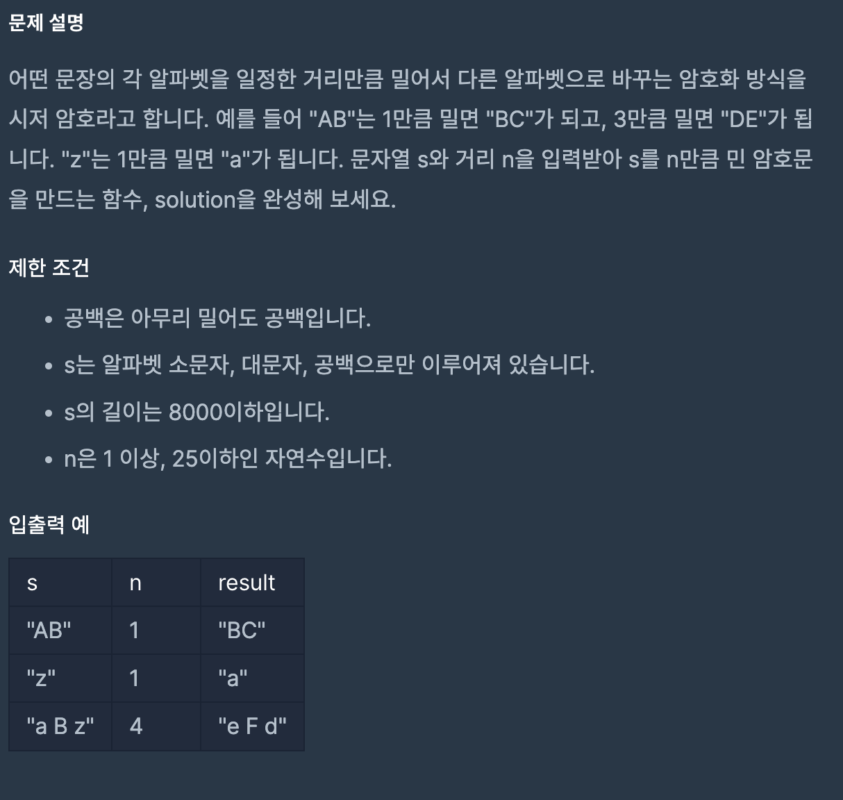 아스키 코드를 사용하지 않고 푼 최선의 방법인 것 같다. 문자열의 인덱스를 사용하였고 그 인덱스를 넘어간 경우엔 문자열의 길이만큼 빼주는 방법.... 최고라고 생각한다.