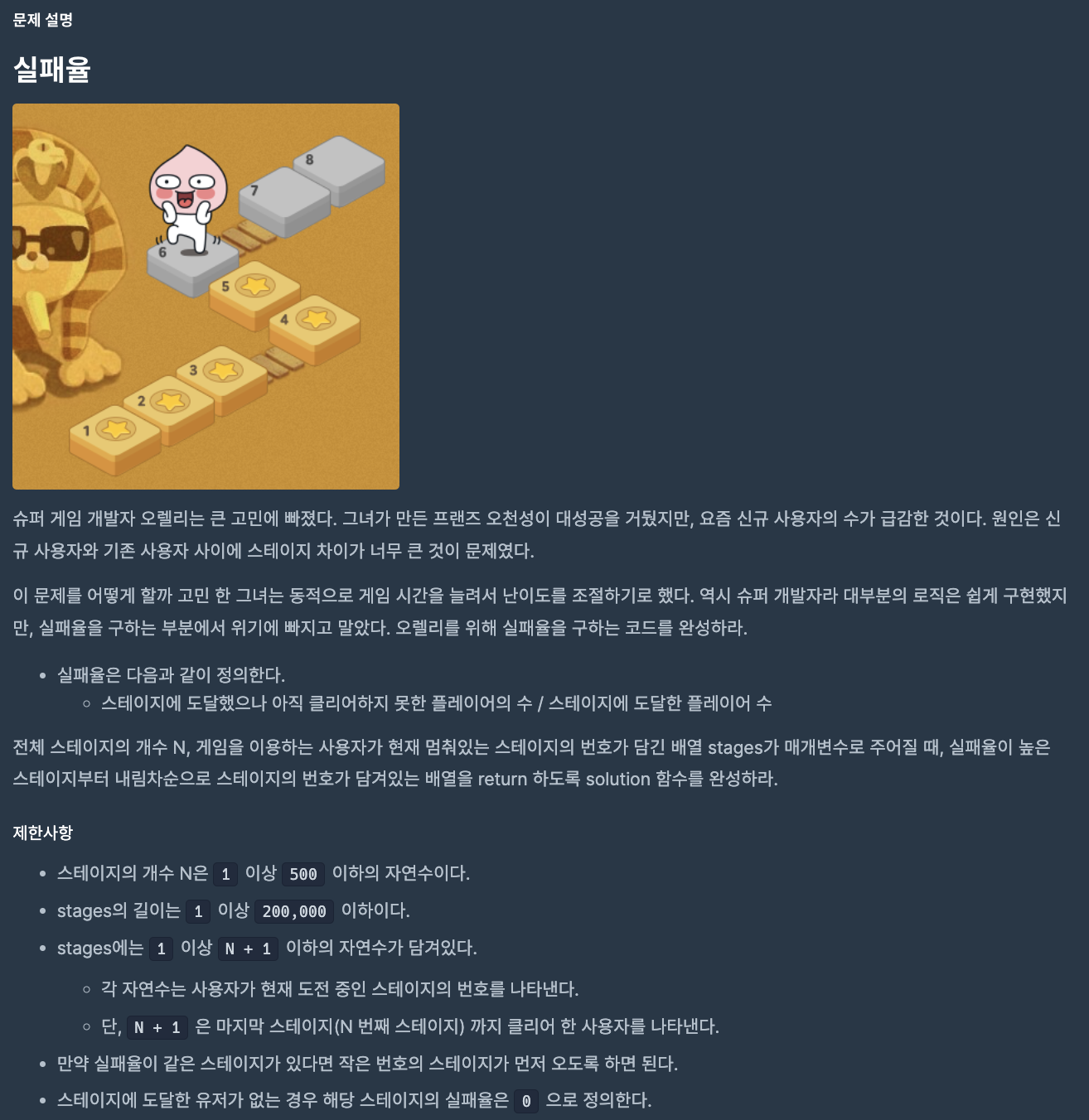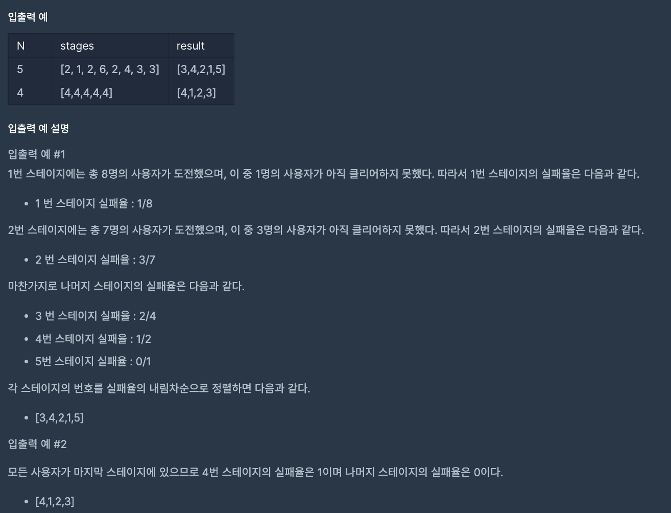 key는 사용자가 현재 멈춰있는 스테이지의 번호, value는 스테이지의 실패율이다.