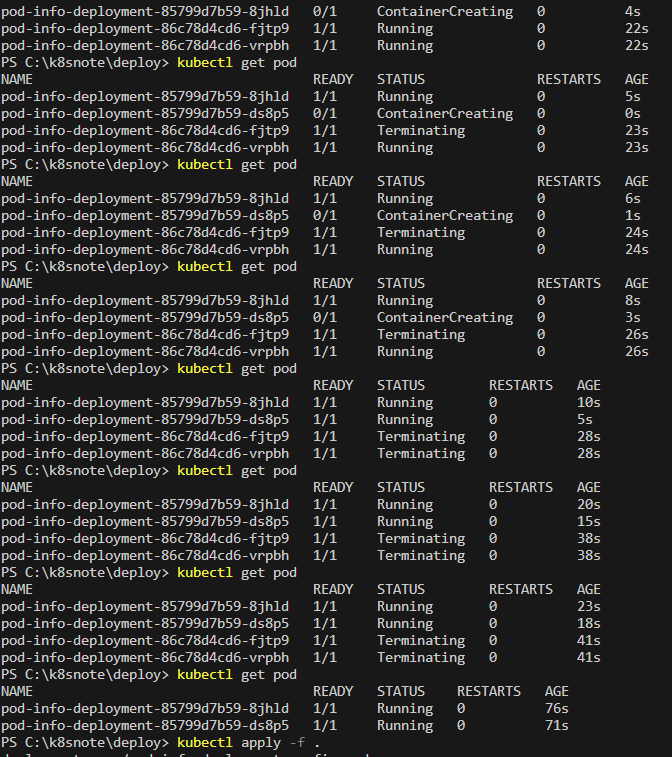 아래처럼 롤링 업데이트가 진행되며 이미지 변경이 pod 무정지 상태로 이루어진다.