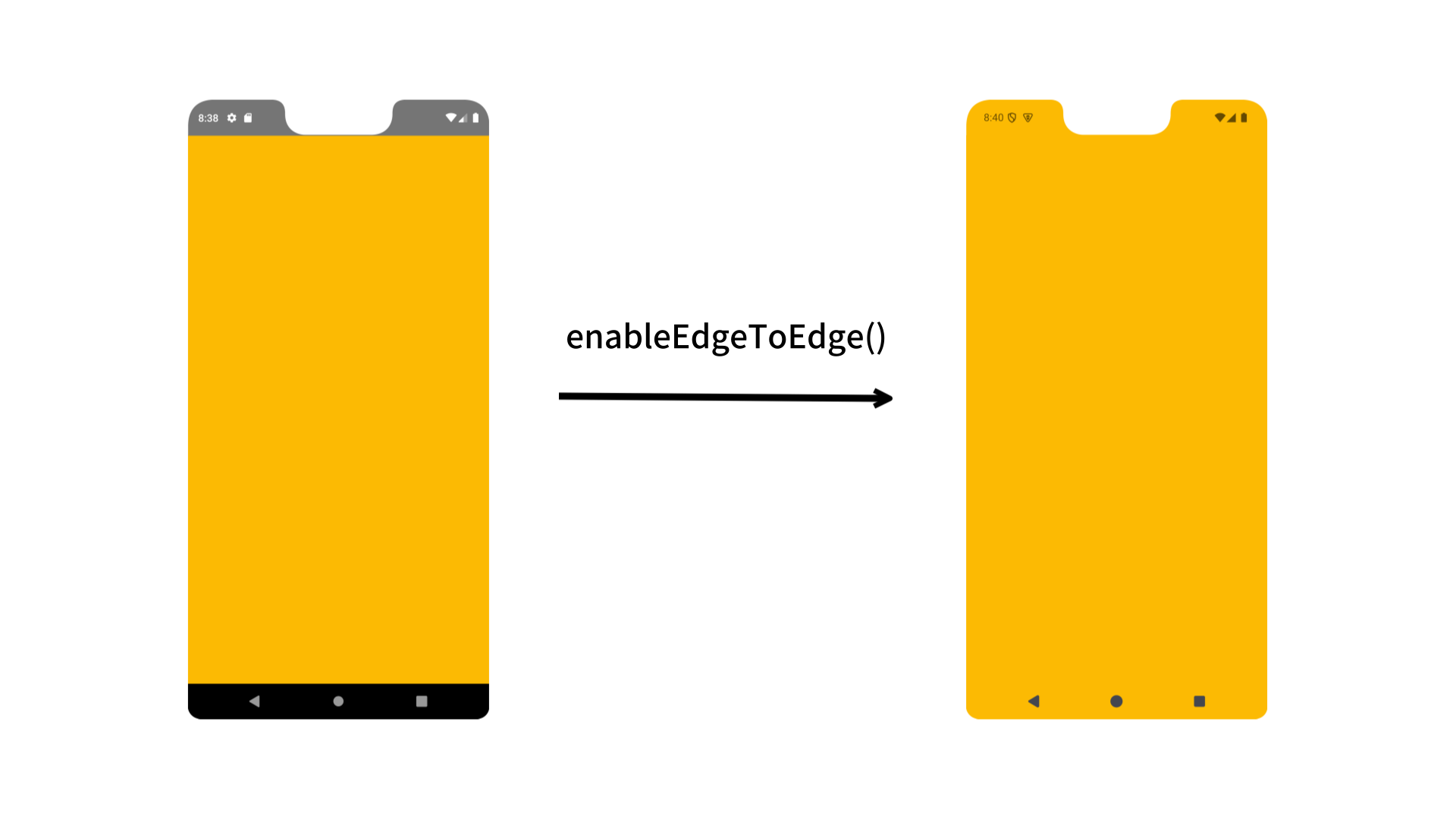 enableEdgeToEdge() 로 인해 상태바와 네비게이션바 영역까지 화면이 확장되어 두 영역의 색상은 화면의 색상과 동일하게 설정됩니다.