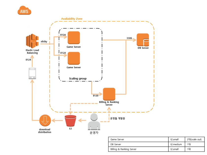 초창기 게임서버와 DB하나로 출발했던 밋치리네코팝은 여러 시행착오를 거쳐 최종적으로 아래의 구조가 되었다. (최대한 운영비를 아끼려 해보았다..😥 클라우드 넘 비싸요 ㅠ) 2017년 초반쯤 아래 구조로 서비스 종료까지 유지했다. 로드 밸런서를 기점으로 리눅스 게임서버 2개를 두었고 MySQL DB서버 1대를 두었다. 그밖에 랭킹과 빌링, 로그를 담당하는 서버가 1대 더 있었고, 에셋번들 다운로드를 위해 S3를 사용했다.