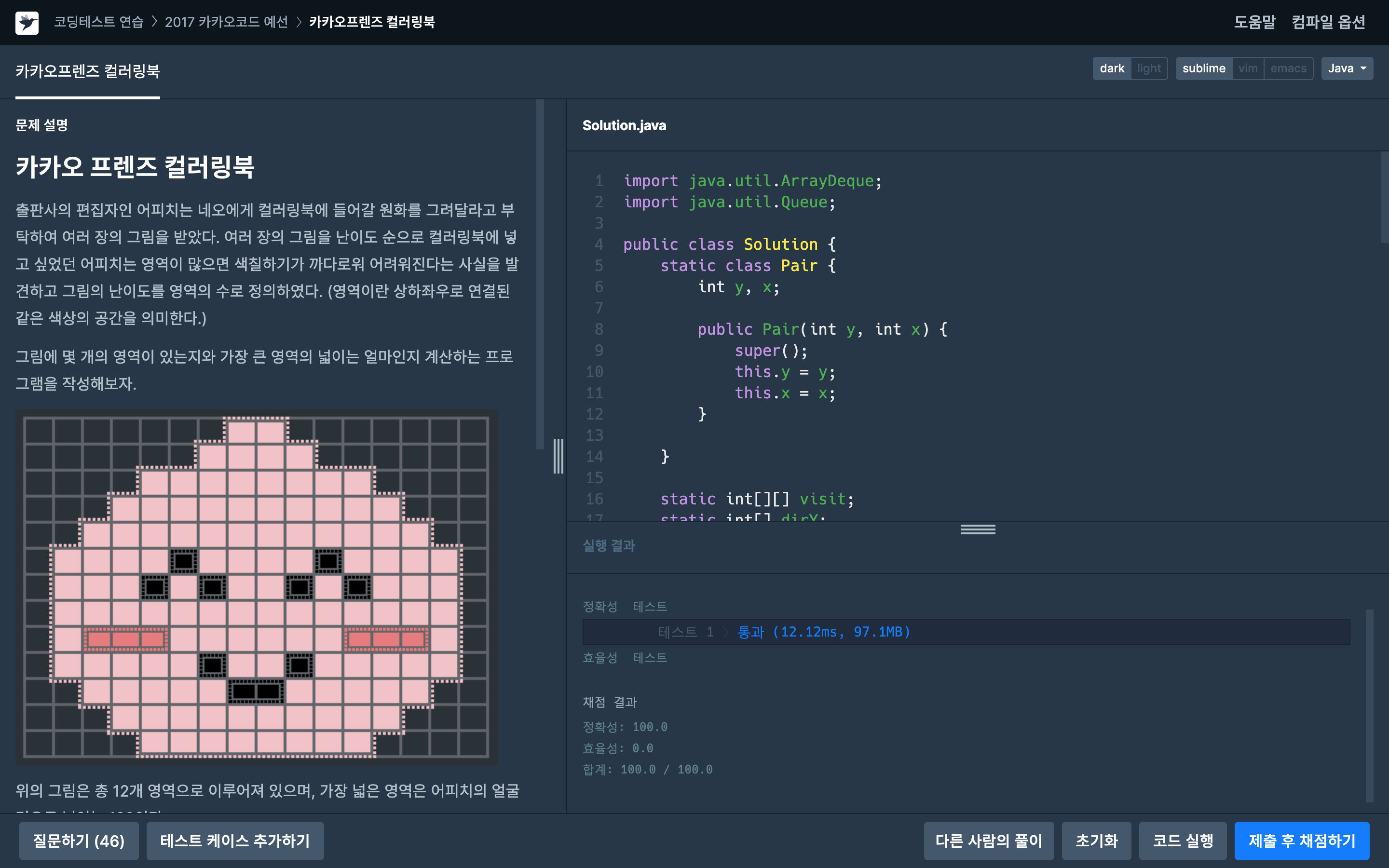 - 이 문제는 BFS를 사용했고 영역의 갯수를 세기 위해서 방문 배열인 visit에 영역의 번호를 저장했다.