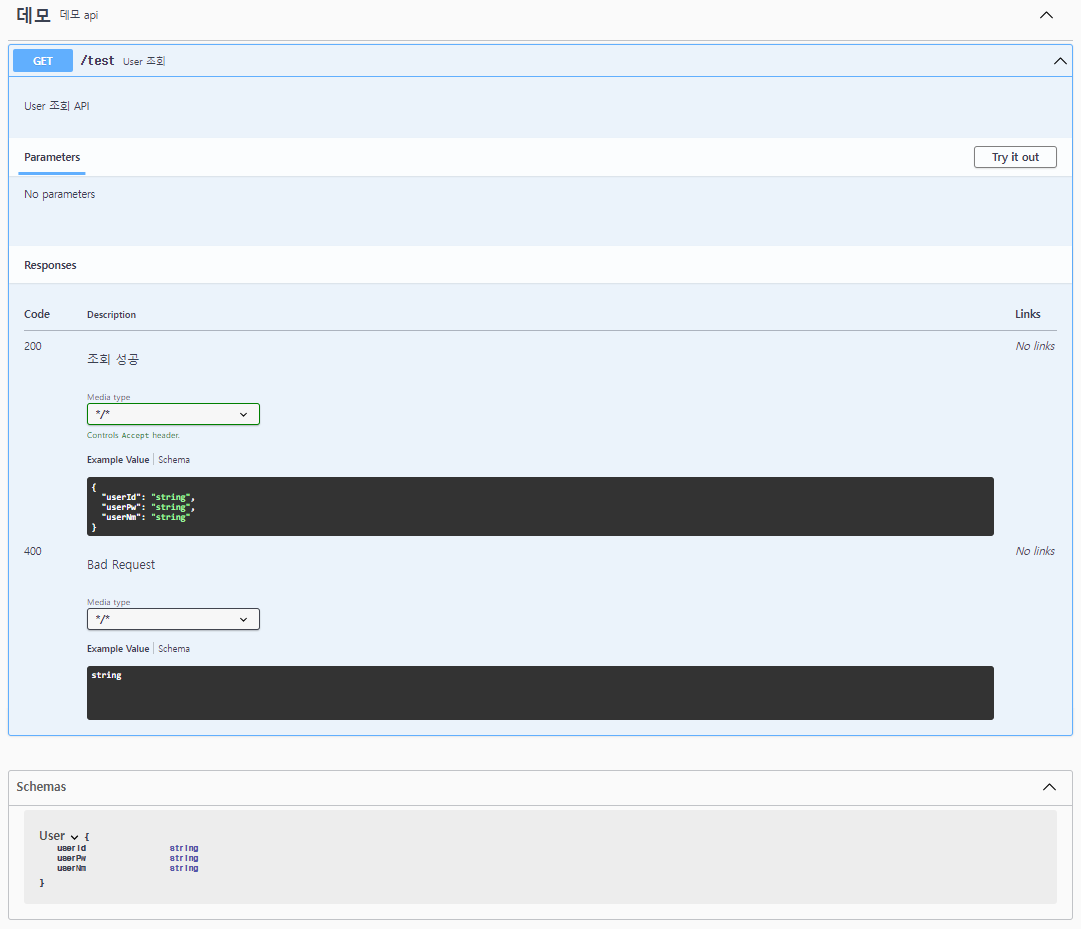 아래 사진과 같이 Schemas에 위에서 전달해준 객체의 정보가 그려진다.