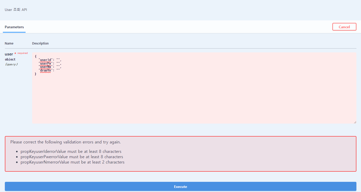 요청해보면 설정에 맞춰 swagger가 벨리데이션 체크를 해준다.