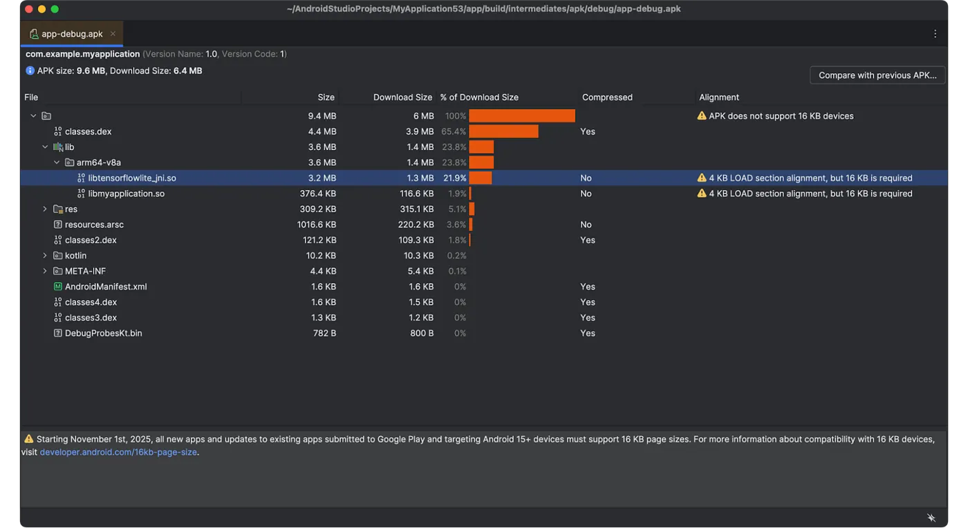 APK Analyzer: 네이티브 라이브러리와 16KB 호환 여부를 식별합니다.