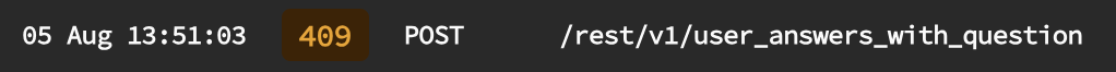 409에러는 특정 데이터가 이미 있다는 의미입니다. 저는 한 유저가 같은 질문에 동일하게 대답하는 경우를 방지하기 위해 user_id와 question_id에 unique constraint를 걸어놓았습니다. 이것이 에러를 발생시키고 있었고, 에러 처리에 대한 부분이 누락되었음을 알게되었습니다.