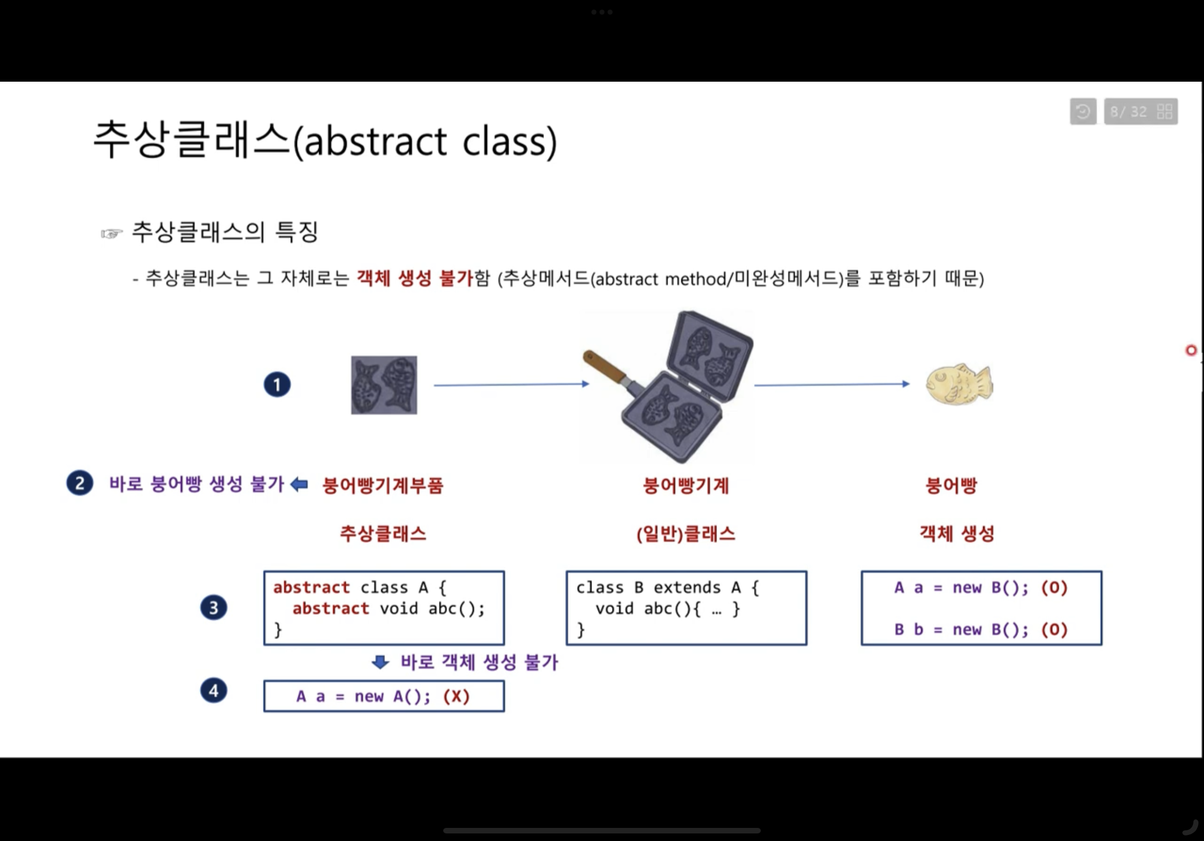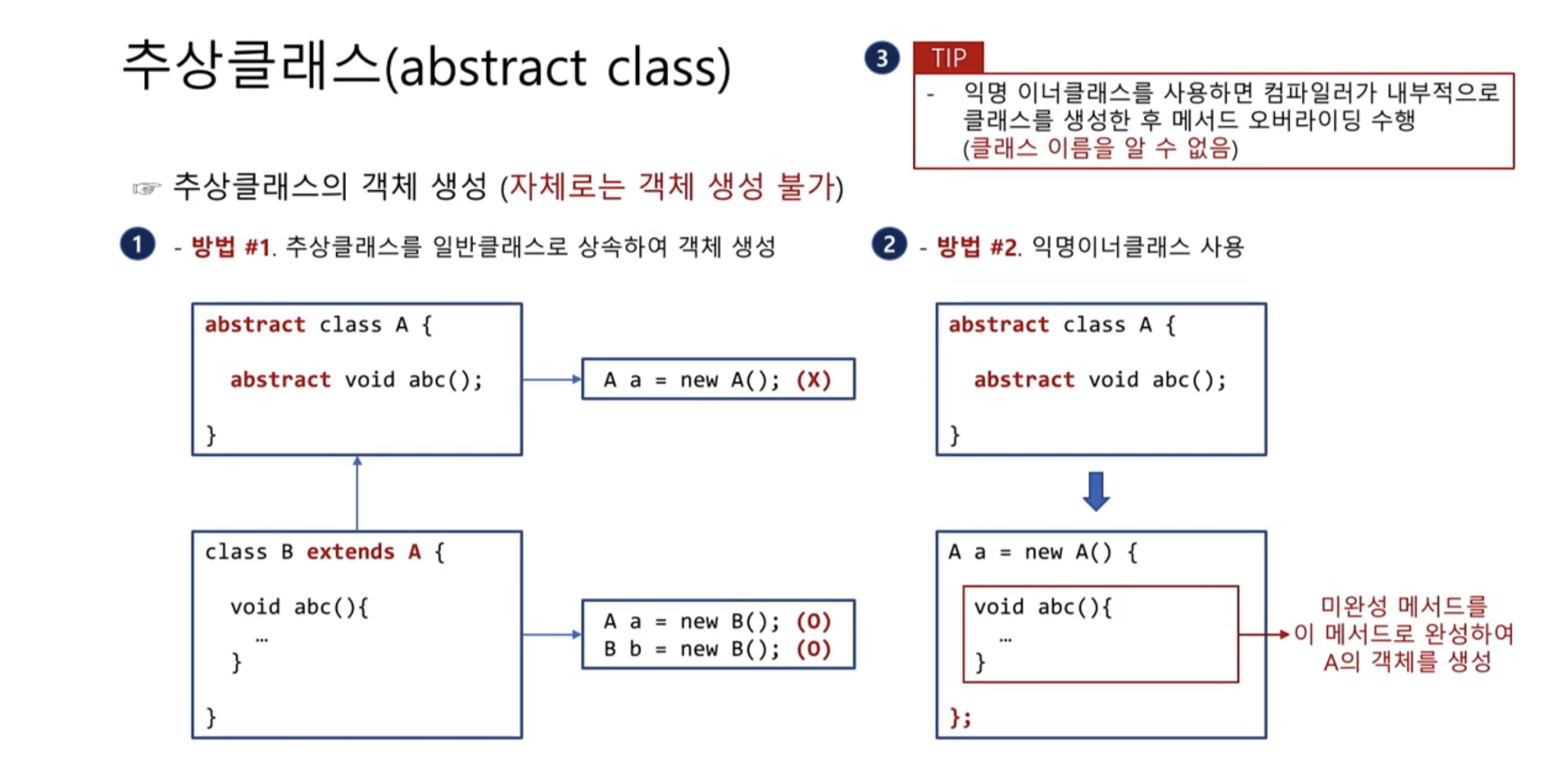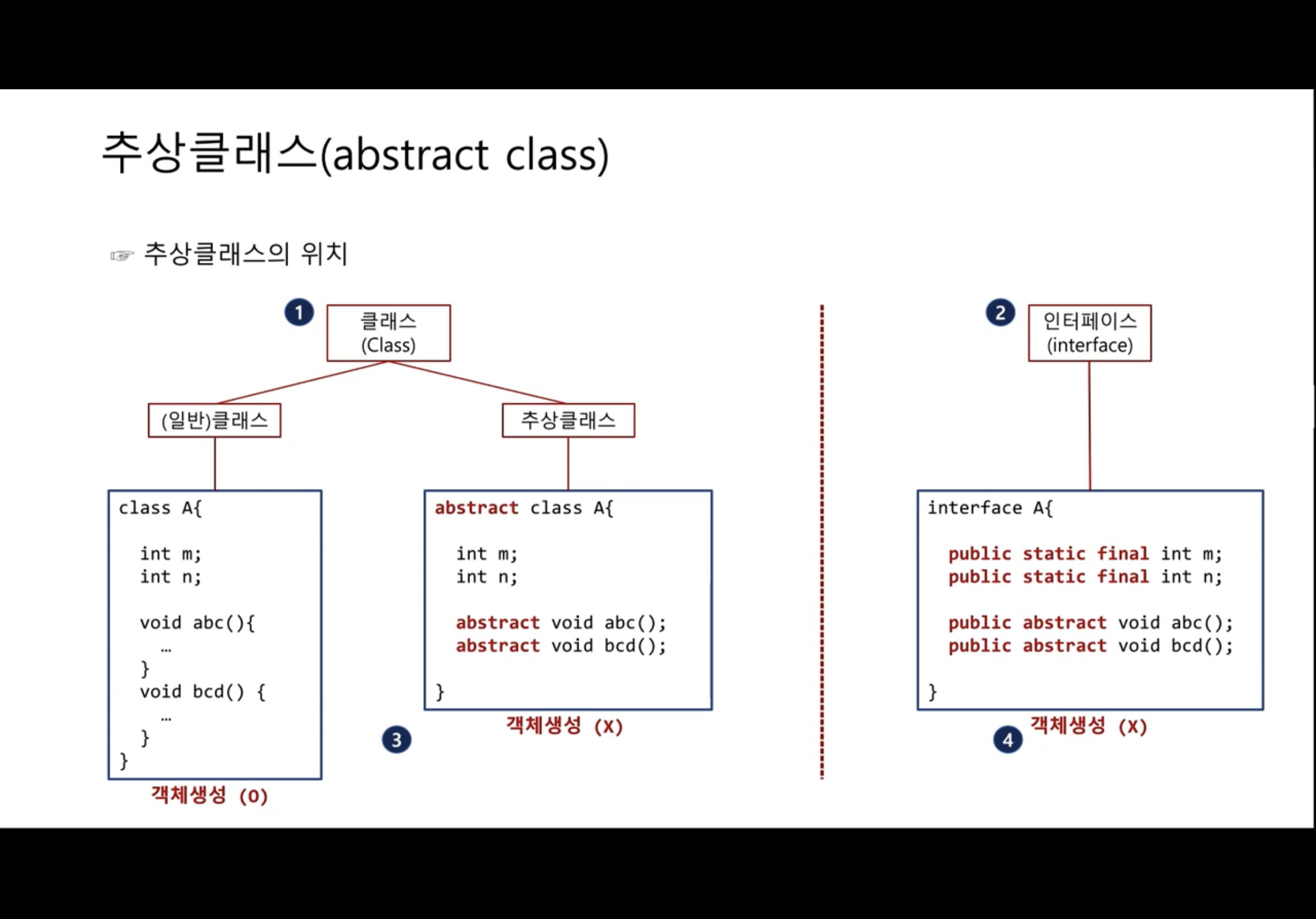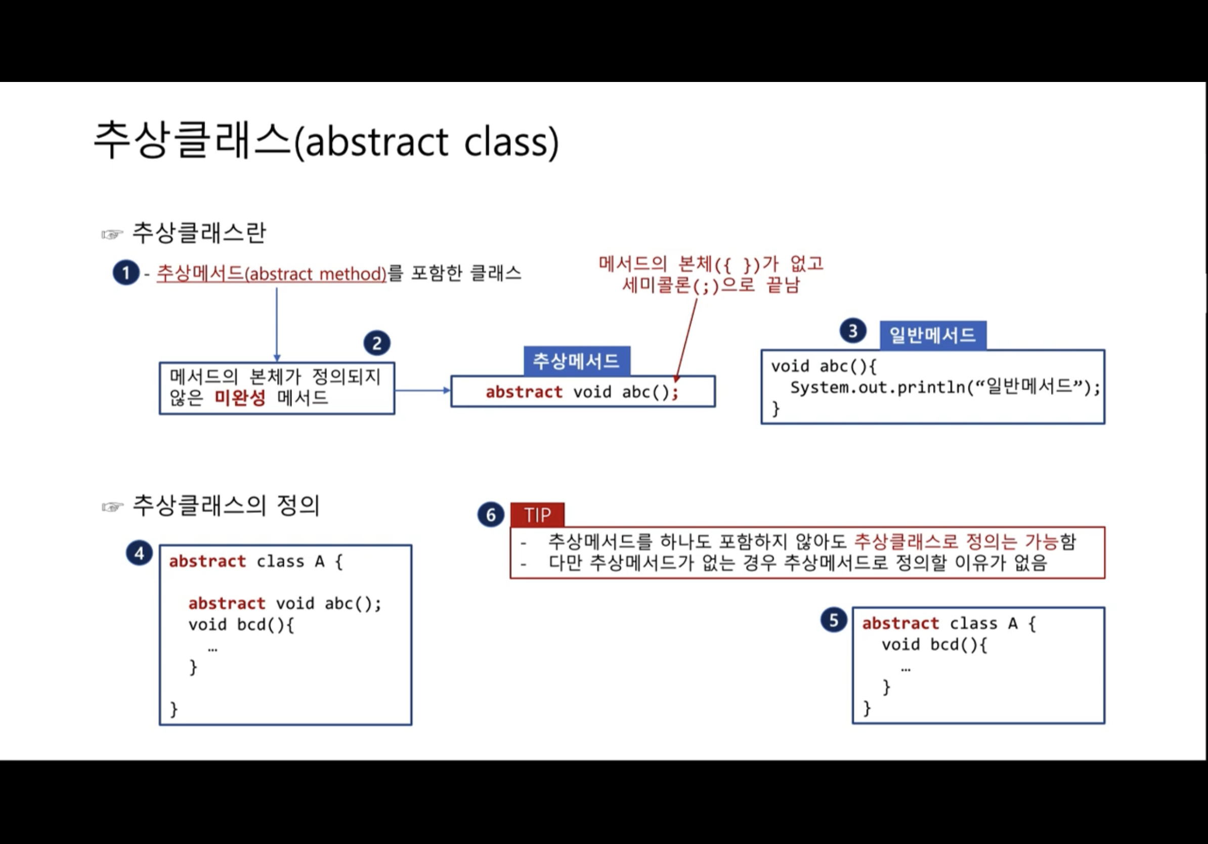 - 클래스 안에 추상 메서드가 한개라도 있으면 추상클래스로 정의 되어야한다.