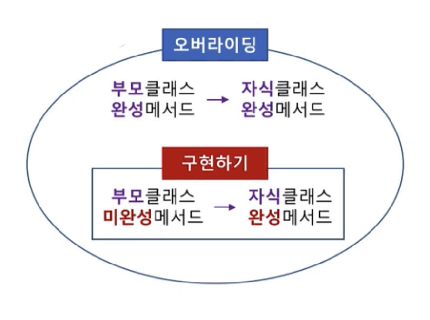 부모클래스의 메서드(완성 또는 미완성)을 자식클래스에서 재정의(완성)