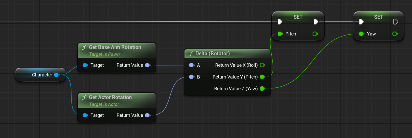 Get Base Aim Rotation(컨트롤러 회전) 과 Get Actor Rotation (케릭터 회전)과의 차이를 계산해서 Pitch와 Yaw로 설정한다.