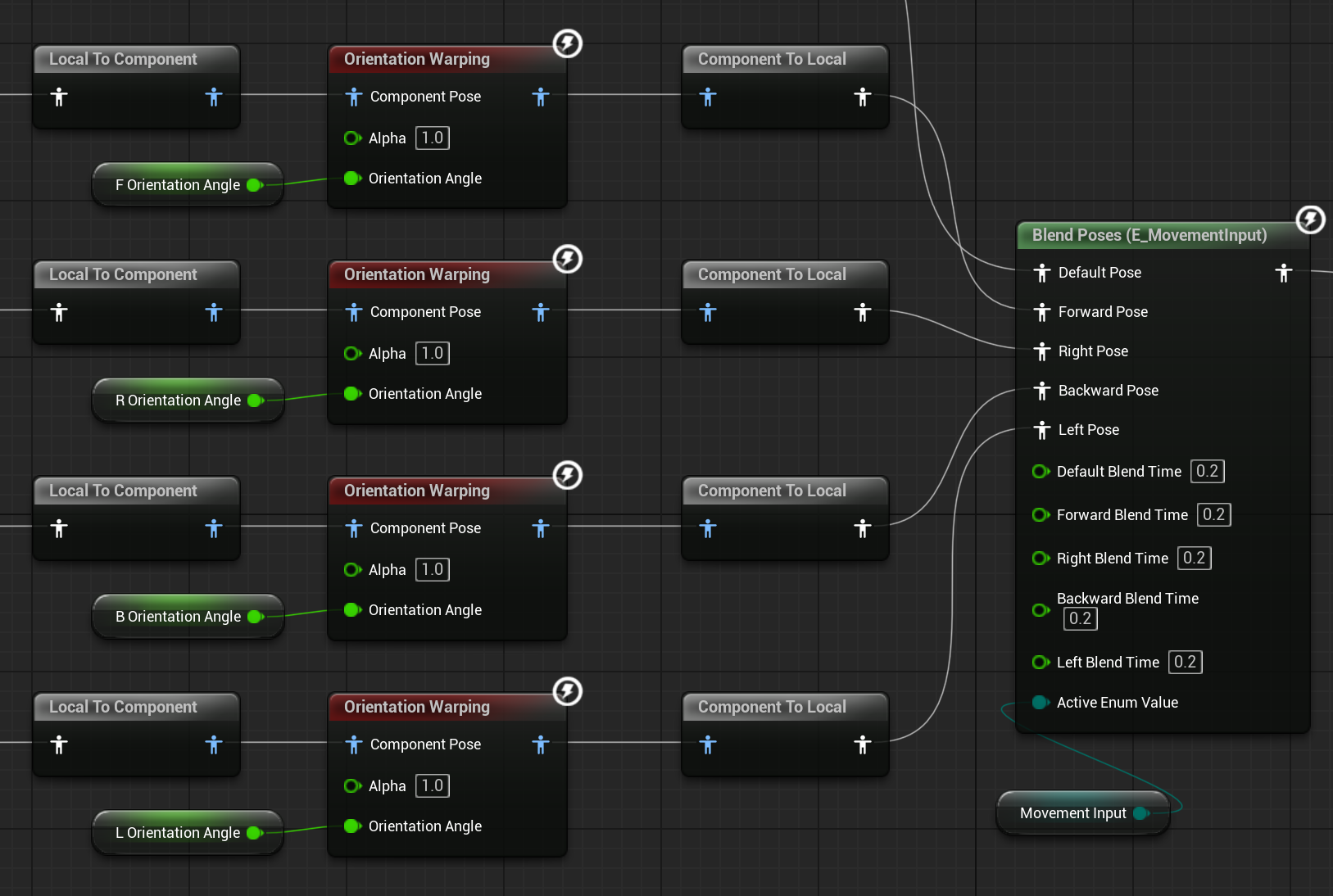 movement input에 따라 앞 뒤 좌 우를 열거형으로 만들고, 각 상태에 따라 애니메이션을 다르게 재생시킨다. 이 때 하체를 방향을 보정하기 위해 Orientation Warping을 사용하였다.