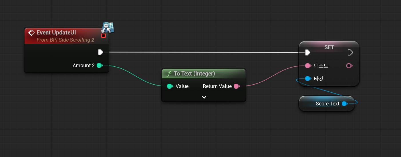 이제 이벤트 그래프로 가서 Update UI가 호출되면 메시지를 받아 이벤트를 수행한다. Score Text의 변수 여부를 켜준 뒤에 입력 받은 Amount 인티저 값을 연결한다.