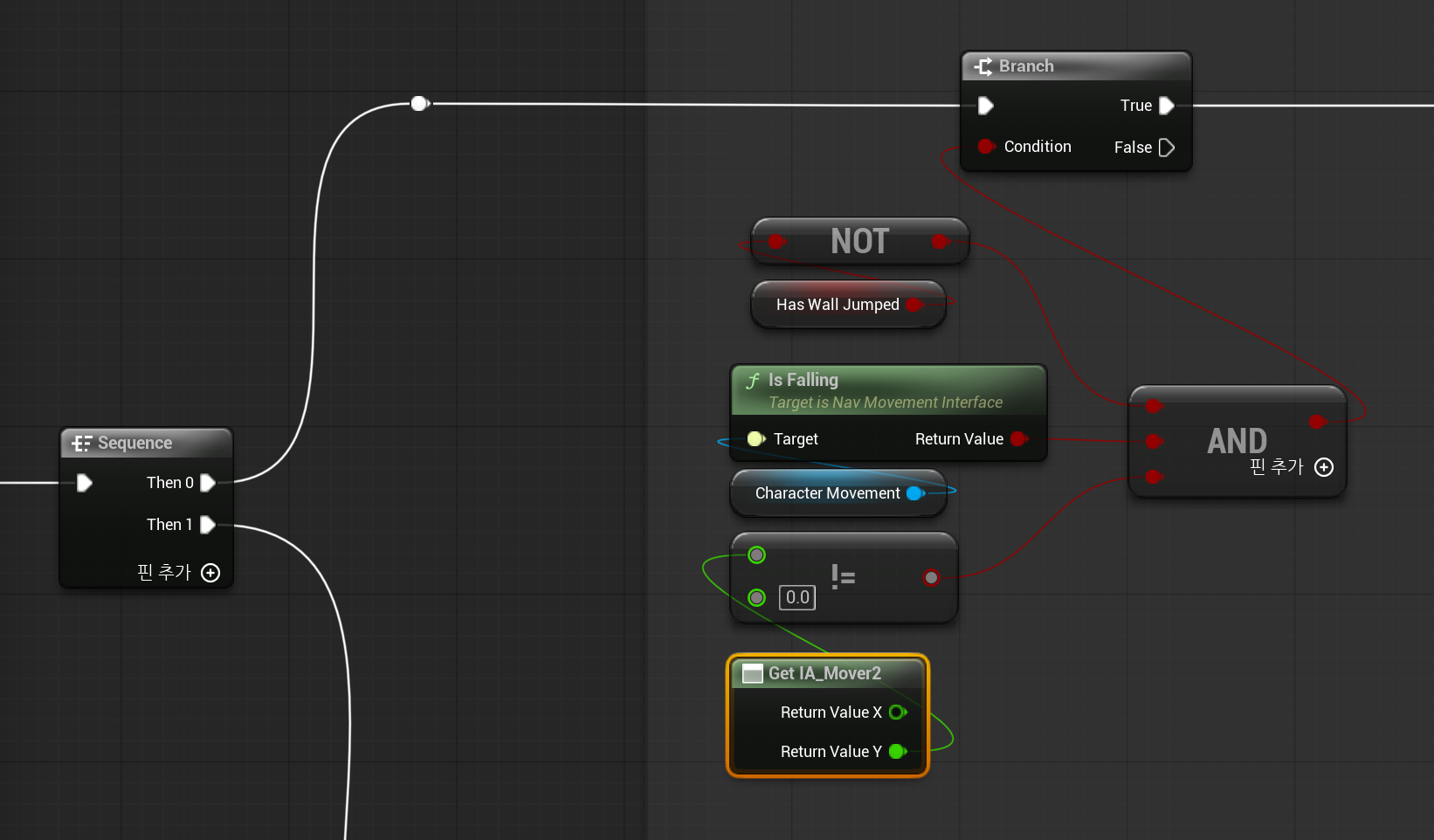 벽 점프 변수가 false일 때, 그리고 Is Falling이 true일 때, 벽에 붙어 움직이지 않을 때도 밀어내면 안되기 떄문에 마지막으로 캐릭터가 이동중인지를 확인한다.