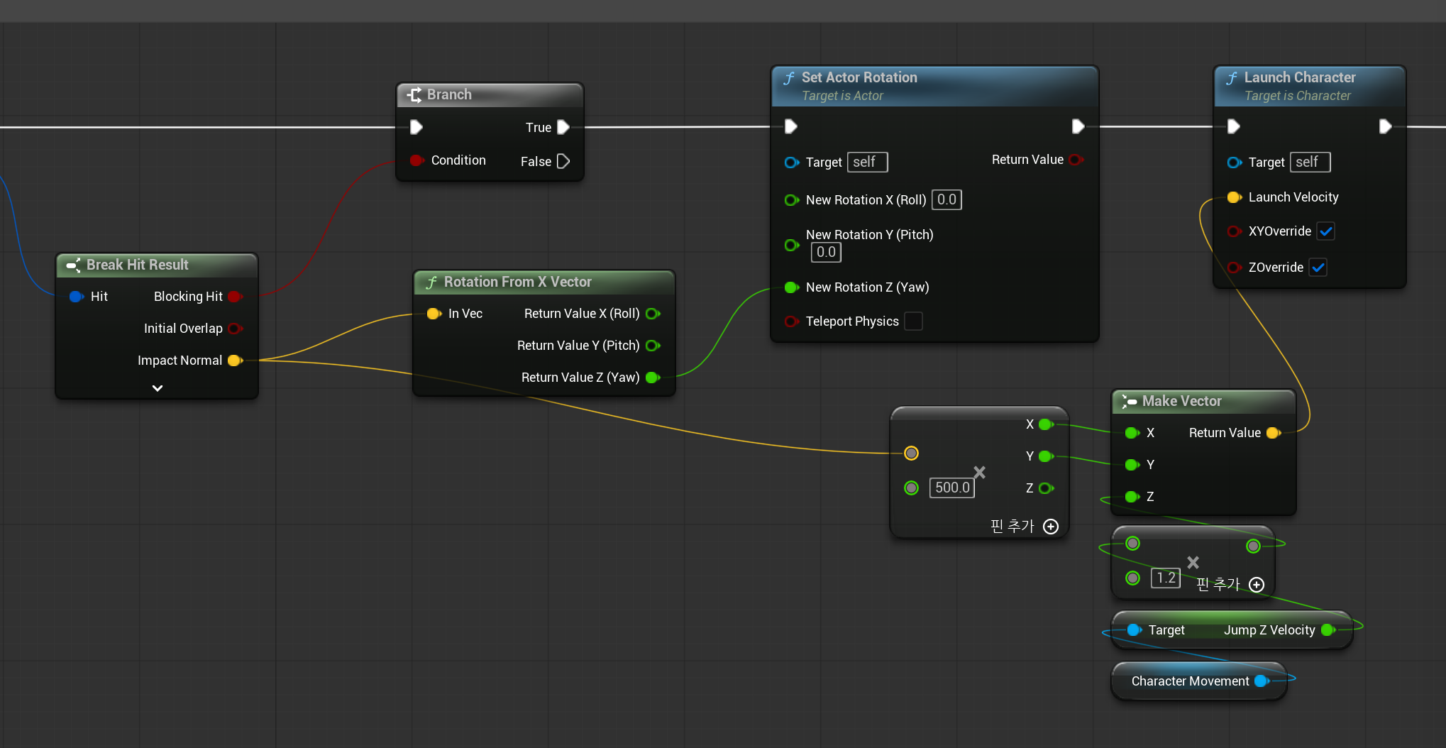 충돌 방향의 Normal Vector로부터 캐릭터의 방향을 반대로 해준 후, 그 방향과 점프속도만큼 override해서 벽 점프 효과를 만들어준다.