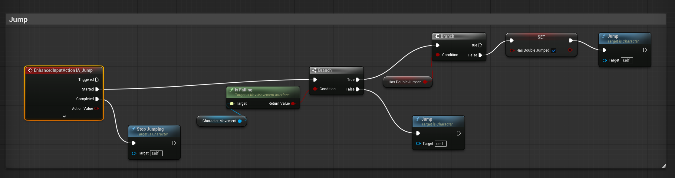 이렇게 해도 더블점프가 되지만 점프일 때와 더블 점프일 때를 구분해서 그래프를 만들기 위해 Is Falling이 false면 1단점프 true면 2단 점프로 branch를 만들어 준다. 그리고 Has Doubled Jumped 변수는 애니메이션 블루프린트에서 사용하기 위해 더블 점프에 대한 상태를 저장한다.