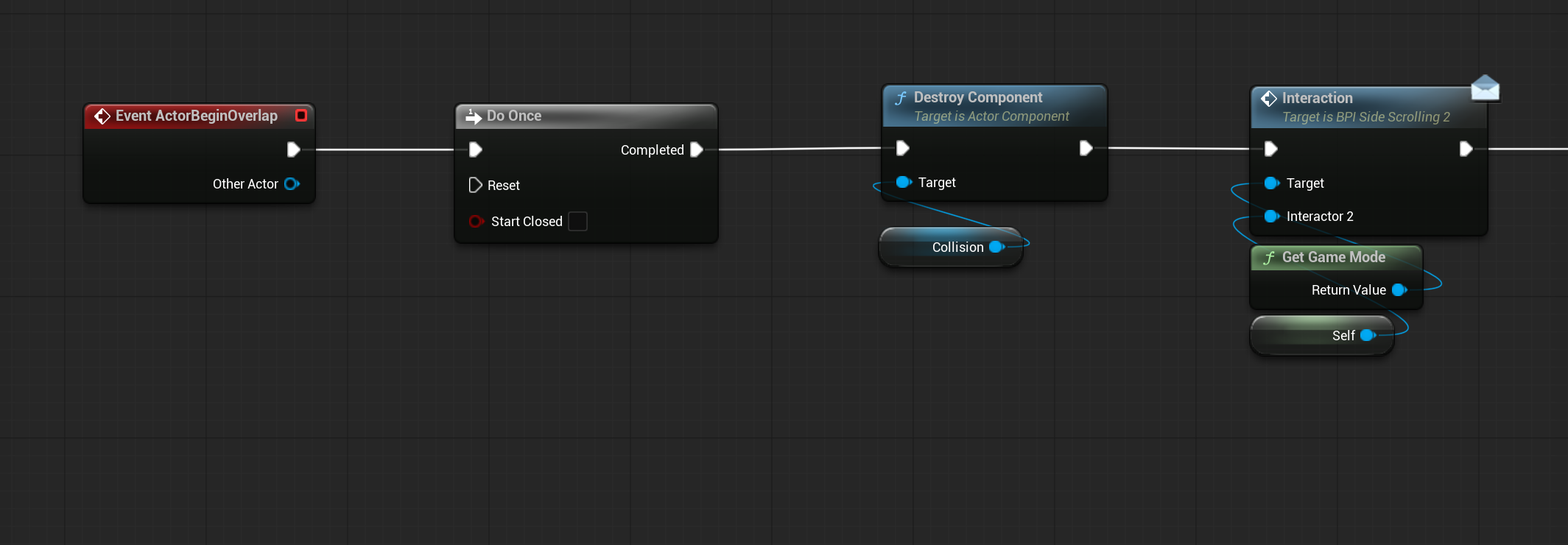 오버렙 이벤트가 시작되면 collision conponent를 제거하고, interaction 메시지를 호출한다.