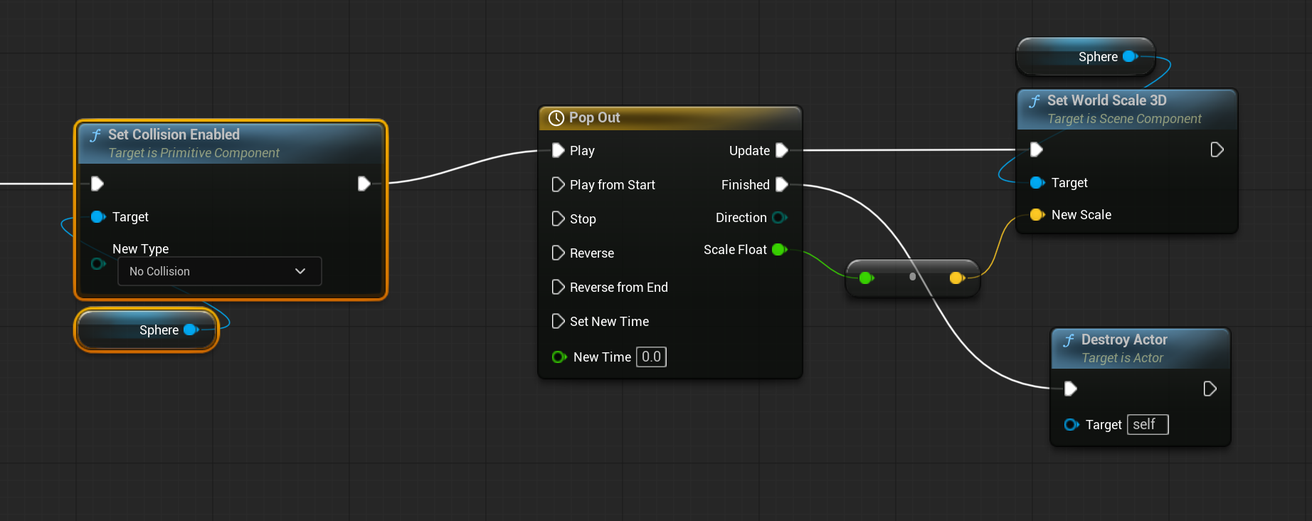 시간에 따라 그래프의 출력만큼 스태틱 메시의 scale을 변화시키고 타임라인이 끝나면 액터를 제거한다.