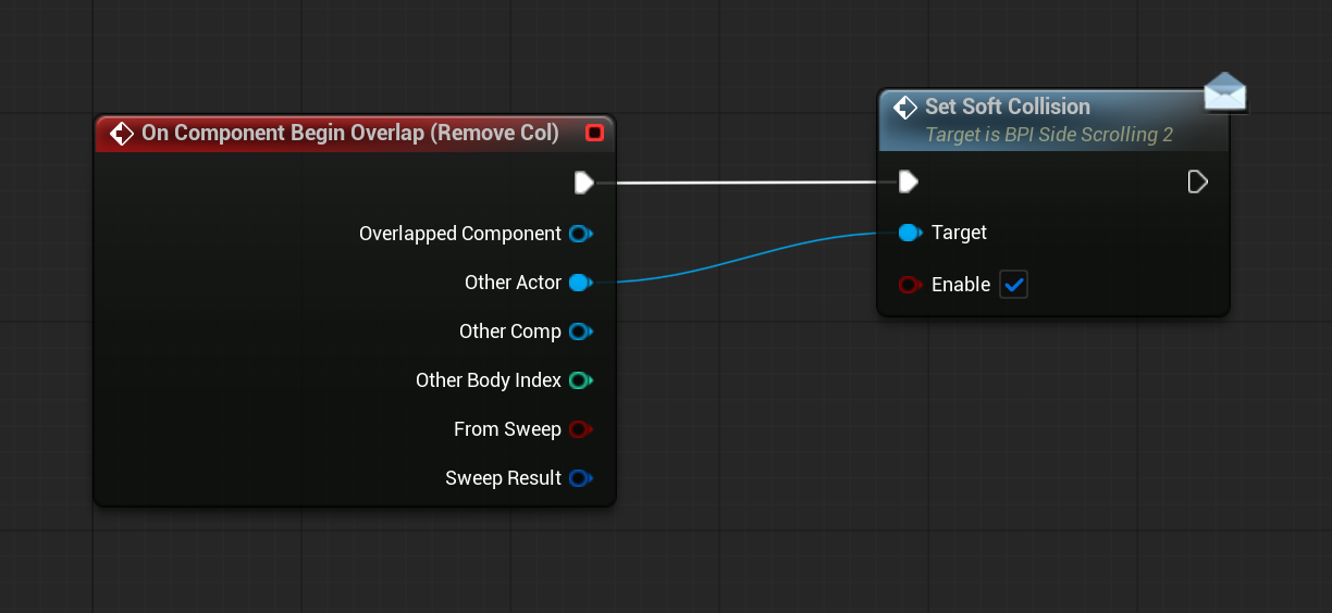 이 액터에서 박스 콜리전에 오버랩 되었을 때 Set Soft Collision을 메시지로 호출한다.