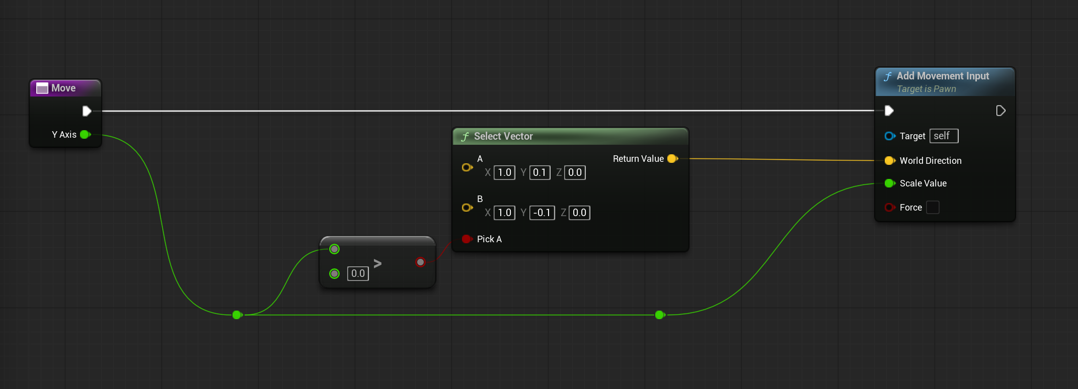 Move함수는 직접 만들어야 하는데, 입력 액션의 Y 값으로 부터 0보다 크면 X가 1인 방향으로, 0보다 작으면 반대로 월드의 방향 벡터를 설정해준다.