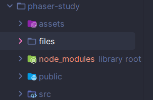 여기서 블로그 마무리하려고 했는데, 한 단계만 더 나아가서 에셋을 불러오는 부분까지 가보면 좋을 것 같다. Phaser3의 tutorial에서 제공하는 zip 파일을 다운받고 IDE에서 구동하면 아래와 같은 디렉토리 구조가 표시된다.