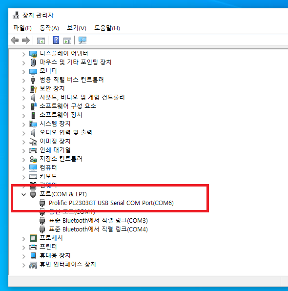 장치관리자를 통해서 COM 포트 확인이 가능하고
