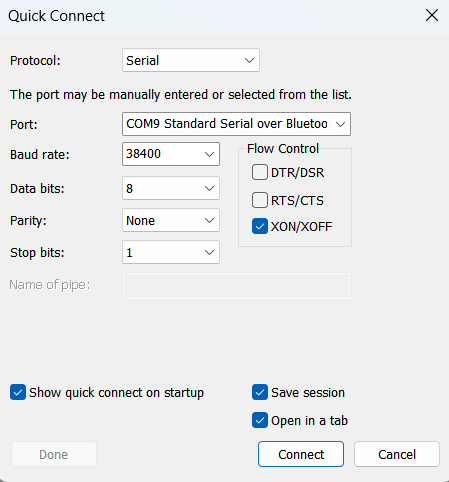 포트번호가 떴다면 이제 SecureCRT을 실행하여 시리얼 프로토콜에서 맞는 포트번호를 연결하면 해당 장비와 연결이 가능하다.